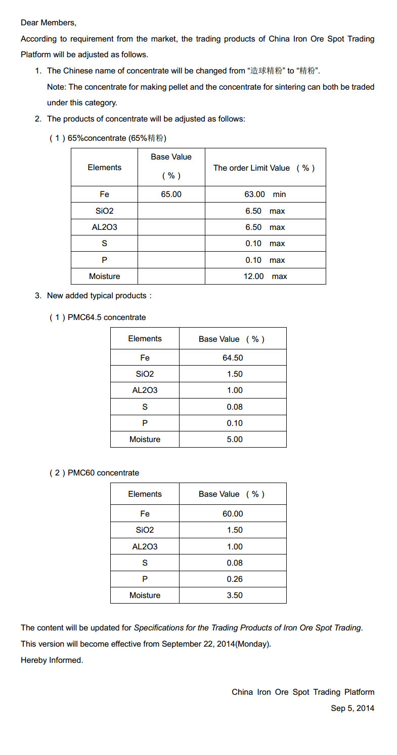 China Iron Ore Spot Trading Platform Announcement for Adjustment of Trading Products