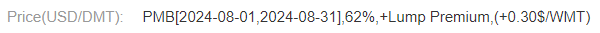 For example, when offering with Lump-Formula 5, PMB 62% August Index and a Settlement P/D of USD 0.3, the price will be displayed as follows: