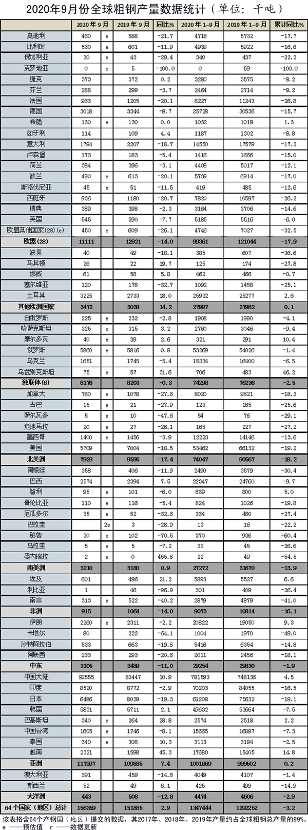 10月23日,世界鋼鐵協(xié)會(WSA)發(fā)布了9月份全球粗鋼產(chǎn)量數(shù)據(jù)。9月份,全球64個納入世界鋼協(xié)統(tǒng)計的國家和地區(qū)粗鋼產(chǎn)量為1.564億噸,同比增長2.9%。