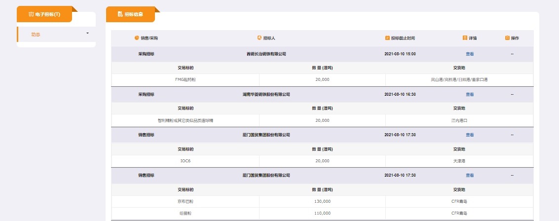 為進一步提升綜合服務能力,滿足行業(yè)企業(yè)對交易合規(guī)性、便利性和購銷渠道多元化的需求,北鐵中心聯合廈門國貿集團等單位,在深入調研的基礎上推出了鐵礦石現貨電子招標系統。據悉,該系統上線當日,廈門國貿、華菱鋼鐵、河鋼國際、首鋼長治等企業(yè)通過系統發(fā)布招標信息,合計30萬噸,購銷品種包括FMG超特粉、巴粗、智利精粉、紐曼粉等品種,交貨地涵蓋天津港、嵐山港、嵐橋港、日照港、青島港、董家口港及江內港口。