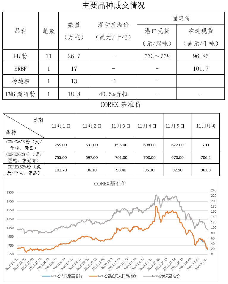 11月1日-11月5日成交17筆共77萬噸,其中在途4筆65.8萬噸,港口13筆11.2萬噸。