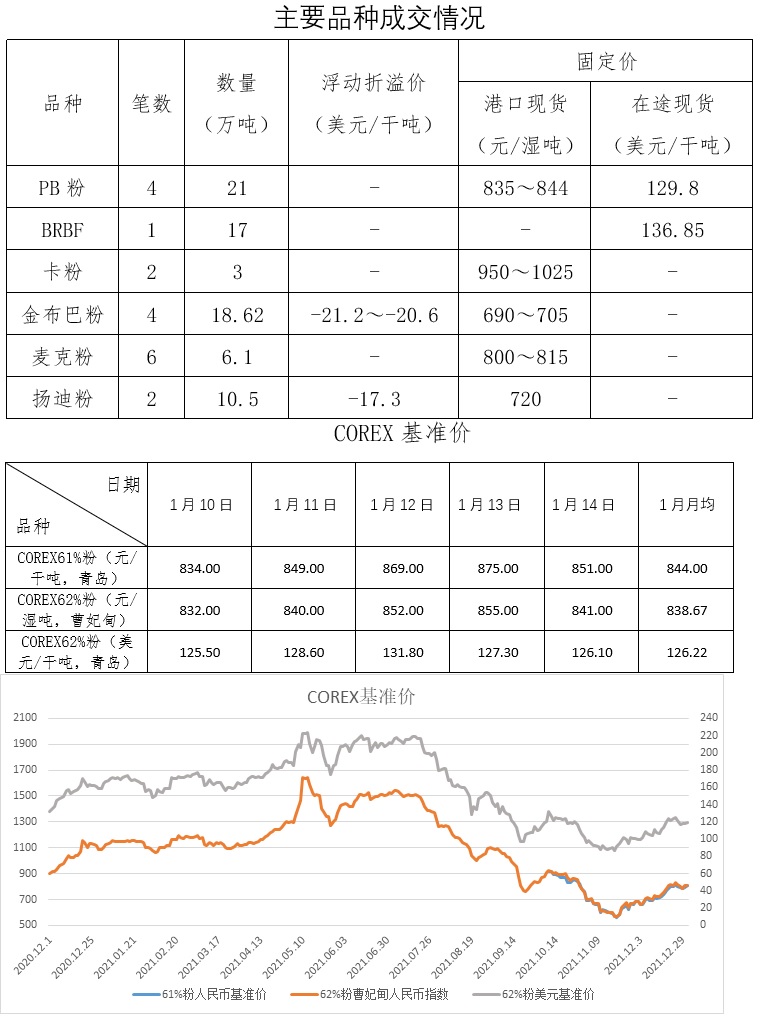 1月10日-1月14日成交39筆共102.44萬(wàn)噸,其中在途5筆59萬(wàn)噸,港口34筆43.44萬(wàn)噸。