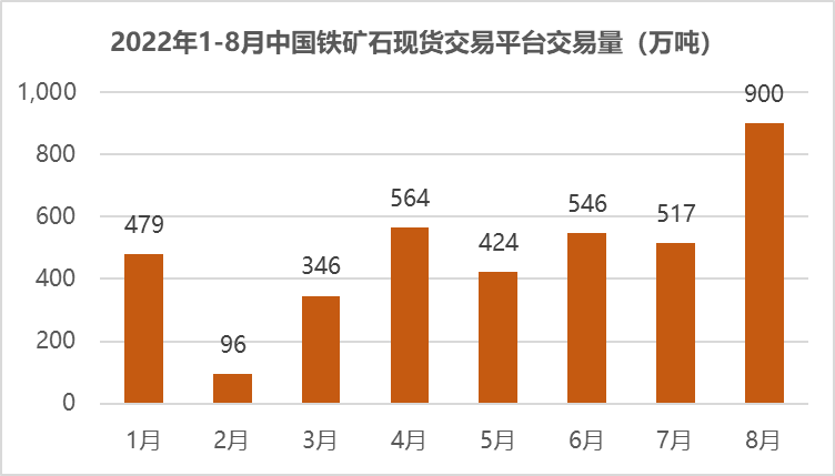 2022年8月,鐵礦石現(xiàn)貨市場活躍度顯著回升,中國鐵礦石現(xiàn)貨交易平臺(簡稱“平臺”)交易量達到900萬噸,其中在途現(xiàn)貨(美元)交易量455萬噸,港口現(xiàn)貨(人民幣)交易量445萬噸,港口現(xiàn)貨板塊首次月成交突破400萬噸。