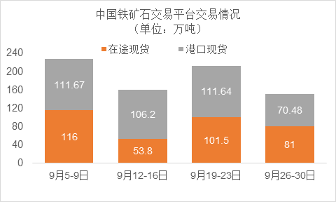 9月26日~9月30日成交69筆共151.48萬(wàn)噸,其中在途8筆共81萬(wàn)噸,港口61筆共70.48萬(wàn)噸。主要成交品種包括:金布巴混合粉13筆共50.5萬(wàn)噸,PB粉12筆共29.72萬(wàn)噸,麥克粉8筆共14.87萬(wàn)噸,BRBF 3筆共4.6萬(wàn)噸, FMG混合粉1筆共1萬(wàn)噸,F(xiàn)MG超特粉1筆共0.6萬(wàn)噸。