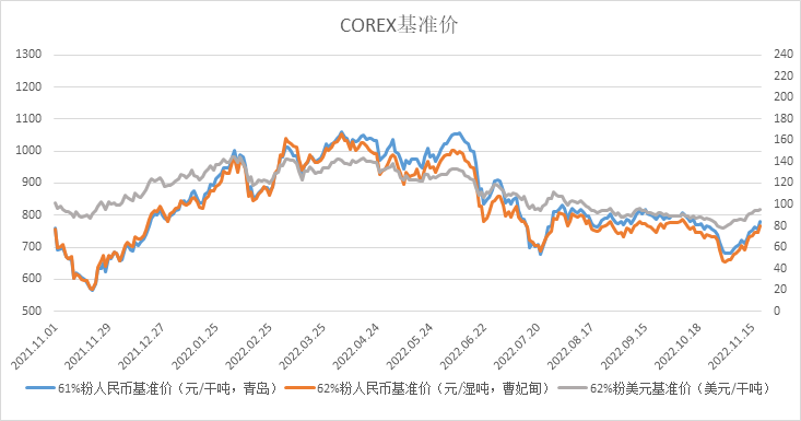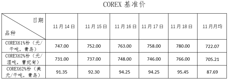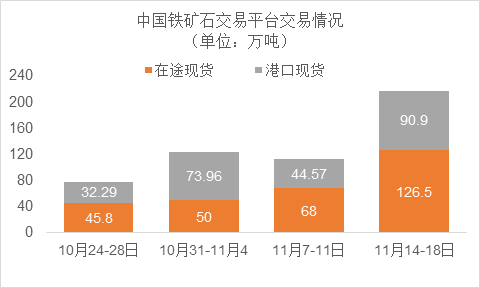 11月14日~11月18日成交94筆共217.4萬(wàn)噸,其中在途9筆共126.5萬(wàn)噸,港口85筆共90.9萬(wàn)噸。主要成交品種包括:PB粉25筆共95.21萬(wàn)噸,麥克粉2筆共2萬(wàn)噸,金布巴混合粉9筆共15.2萬(wàn)噸,紐曼塊3筆共10.1萬(wàn)噸,揚(yáng)迪粉2筆共17萬(wàn)噸,BRBF 1筆共17萬(wàn)噸,F(xiàn)MG混合粉9筆共12.5萬(wàn)噸,F(xiàn)MG超特粉6筆共3.3萬(wàn)噸。