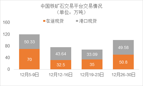 12月26日~12月30日成交48筆共100.38萬(wàn)噸,其中在途4筆共50.8萬(wàn)噸,港口44筆共49.58萬(wàn)噸。主要成交品種包括:PB粉14筆共49.44萬(wàn)噸,金布巴混合粉7筆共4.74萬(wàn)噸,BRBF 4筆13.46萬(wàn)噸,麥克粉2筆共3萬(wàn)噸,紐曼塊1筆共8萬(wàn)噸,F(xiàn)MG混合粉4筆共3.31萬(wàn)噸。