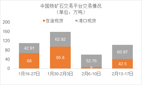 2月13日~2月17日成交61筆共103.47萬(wàn)噸,其中在途4筆共42.5萬(wàn)噸,港口57筆共60.97萬(wàn)噸。主要成交品種包括:PB粉15筆共33.7萬(wàn)噸,金布巴混合粉4筆共11.1萬(wàn)噸,紐曼塊1筆共8萬(wàn)噸,麥克粉3筆共6萬(wàn)噸,卡拉加斯粉3筆3萬(wàn)噸,BRBF 1筆8.5萬(wàn)噸,F(xiàn)MG超特粉8筆共8.56萬(wàn)噸,F(xiàn)MG混合粉4筆共3.9萬(wàn)噸。
