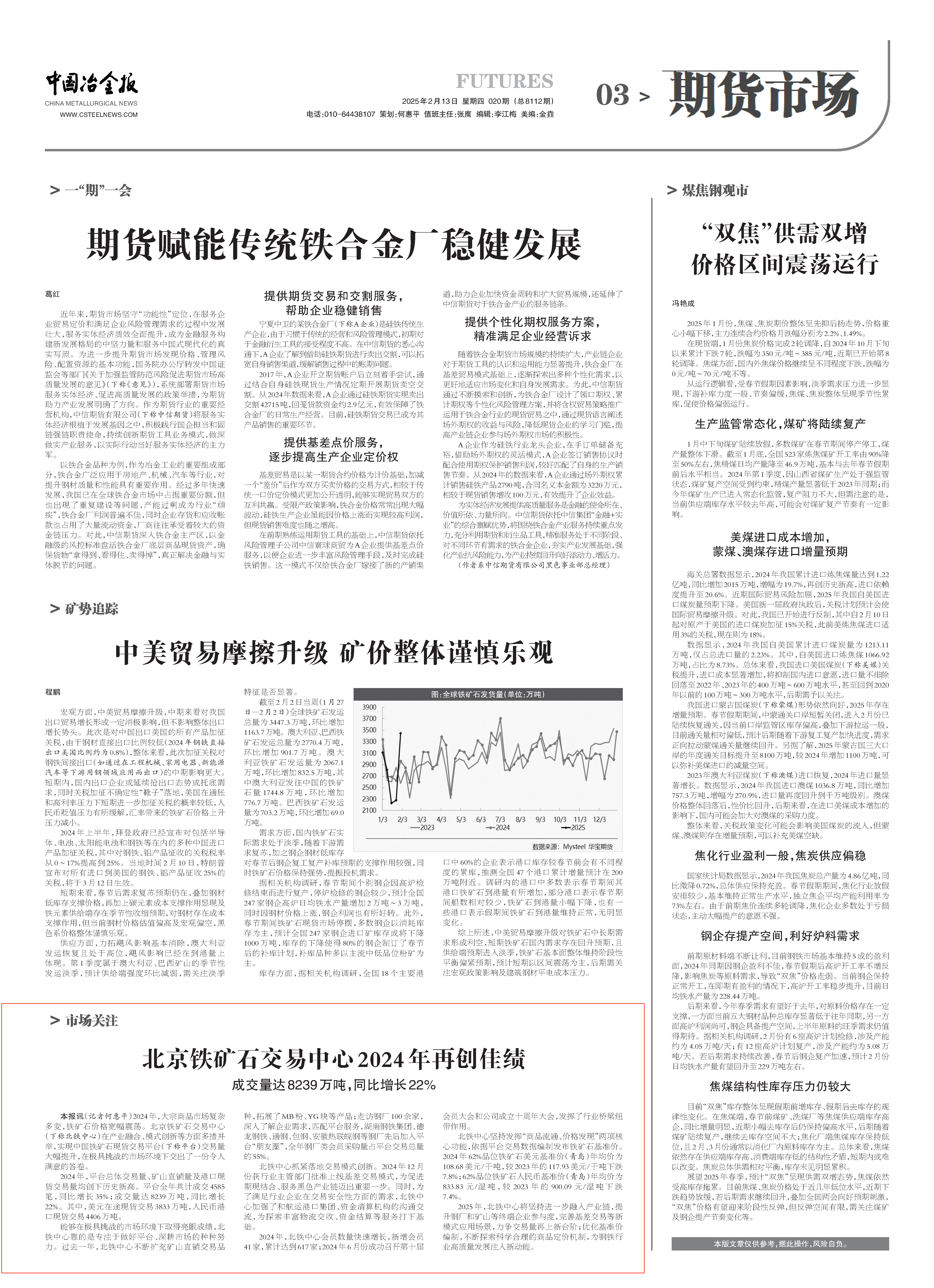 本報(bào)訊(記者何惠平)2024年,大宗商品市場(chǎng)復(fù)雜多變,鐵礦石價(jià)格寬幅震蕩。北京鐵礦石交易中心(下稱北鐵中心)在產(chǎn)業(yè)融合、模式創(chuàng)新等方面多措并舉,實(shí)現(xiàn)中國(guó)鐵礦石現(xiàn)貨交易平臺(tái)(下稱平臺(tái))交易量大幅提升,在極具挑戰(zhàn)的市場(chǎng)環(huán)境下交出了一份令人滿意的答卷。