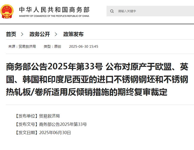 6月30日,商務部發(fā)布公告,公布了對原產(chǎn)于歐盟、英國、韓國和印度尼西亞的進口不銹鋼鋼坯和不銹鋼熱軋板/卷所適用反傾銷措施的期終復審裁定。